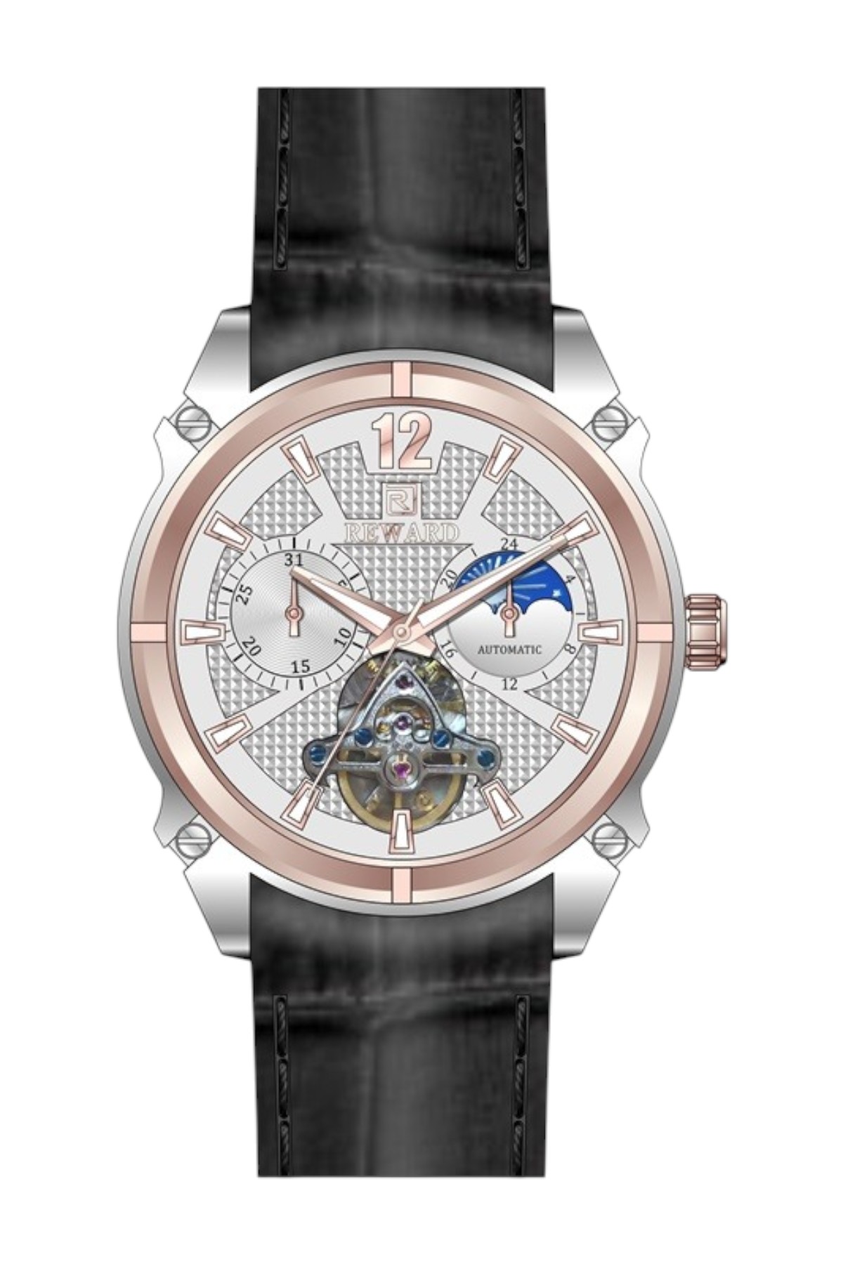 Reward erkek kol saati; günlük kullanımda şıklık ve konforu bir araya getirir.; Ürün Özellikleri: – Mekanizma: Otomatik – Kasa Materyali: Çelik (Rose Gold Altın) – Kordon Materyali: Deri (Lacivert) – Kadran Rengi: Lacivert – Kasa Çapı: 45 mm – Takvim: Yok