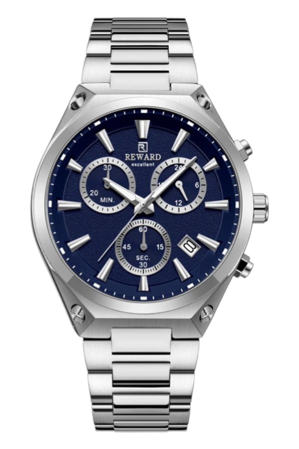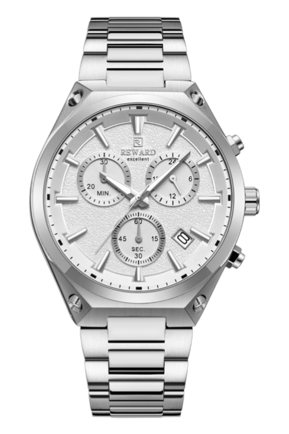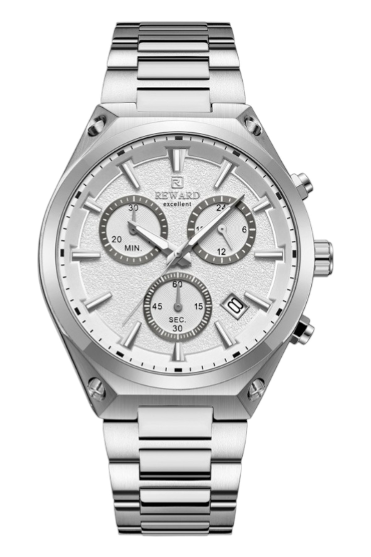Reward erkek kol saati; günlük kullanımda şıklık ve konforu bir araya getirir.; Ürün Özellikleri: – Mekanizma: Quartz – Kasa Materyali: Çelik (Altın-Gümüş) – Kordon Materyali: Çelik (Altın-Gümüş) – Kadran Rengi: Beyaz – Kasa Çapı: 46 mm – Takvim: Var