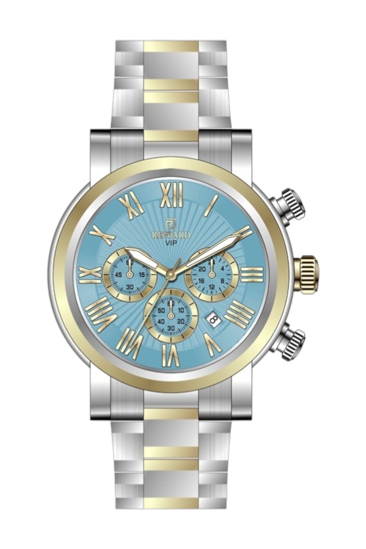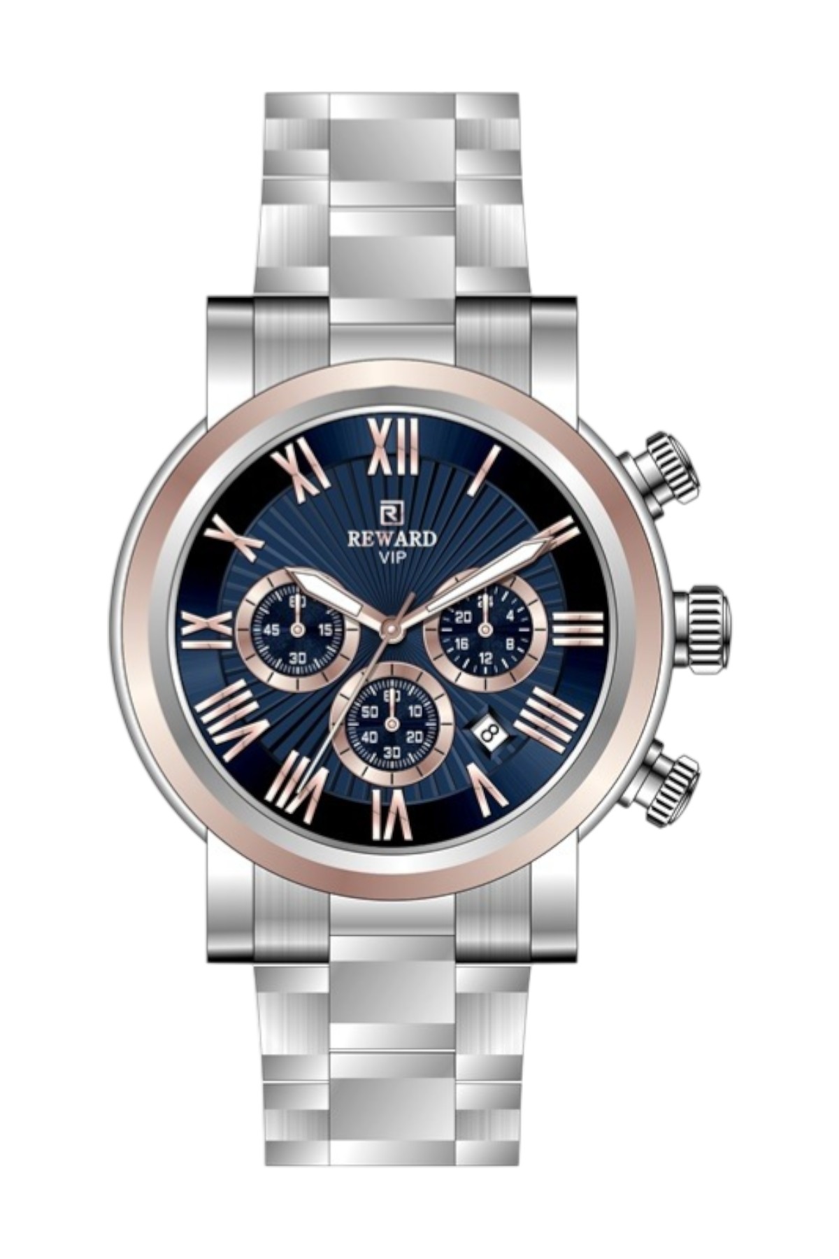 Reward erkek kol saati; günlük kullanımda şıklık ve konforu bir araya getirir.; Ürün Özellikleri: – Mekanizma: Quartz – Kasa Materyali: Çelik (Gümüş-Altın) – Kordon Materyali: Çelik (Gümüş-Altın) – Kadran Rengi: Gümüş – Kasa Çapı: 43 mm – Takvim: Var