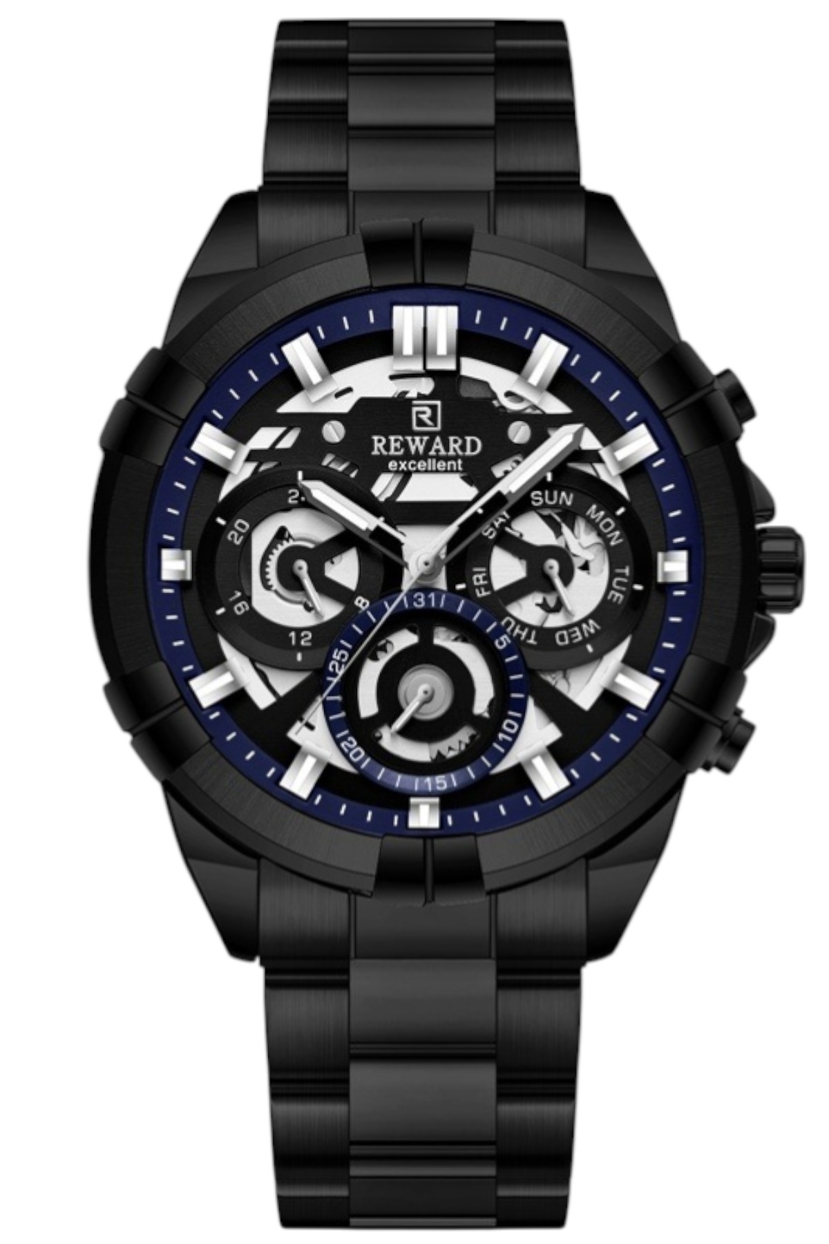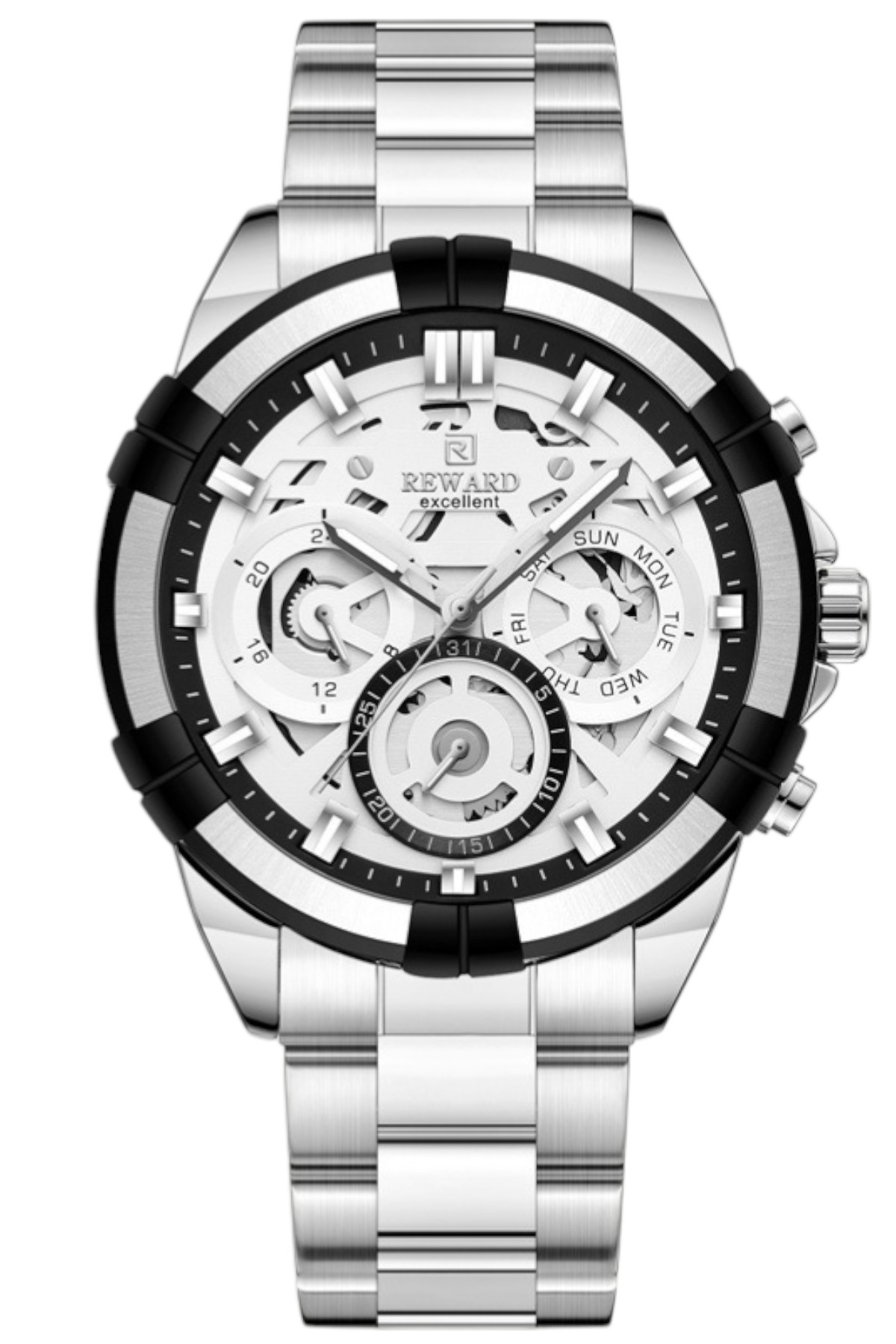Reward erkek kol saati; günlük kullanımda şıklık ve konforu bir araya getirir.; Ürün Özellikleri: – Mekanizma: Quartz – Kasa Materyali: Çelik (Gümüş) – Kordon Materyali: Çelik (Gümüş) – Kadran Rengi: Gümüş-Siyah – Kasa Çapı: 47 mm – Takvim: Var