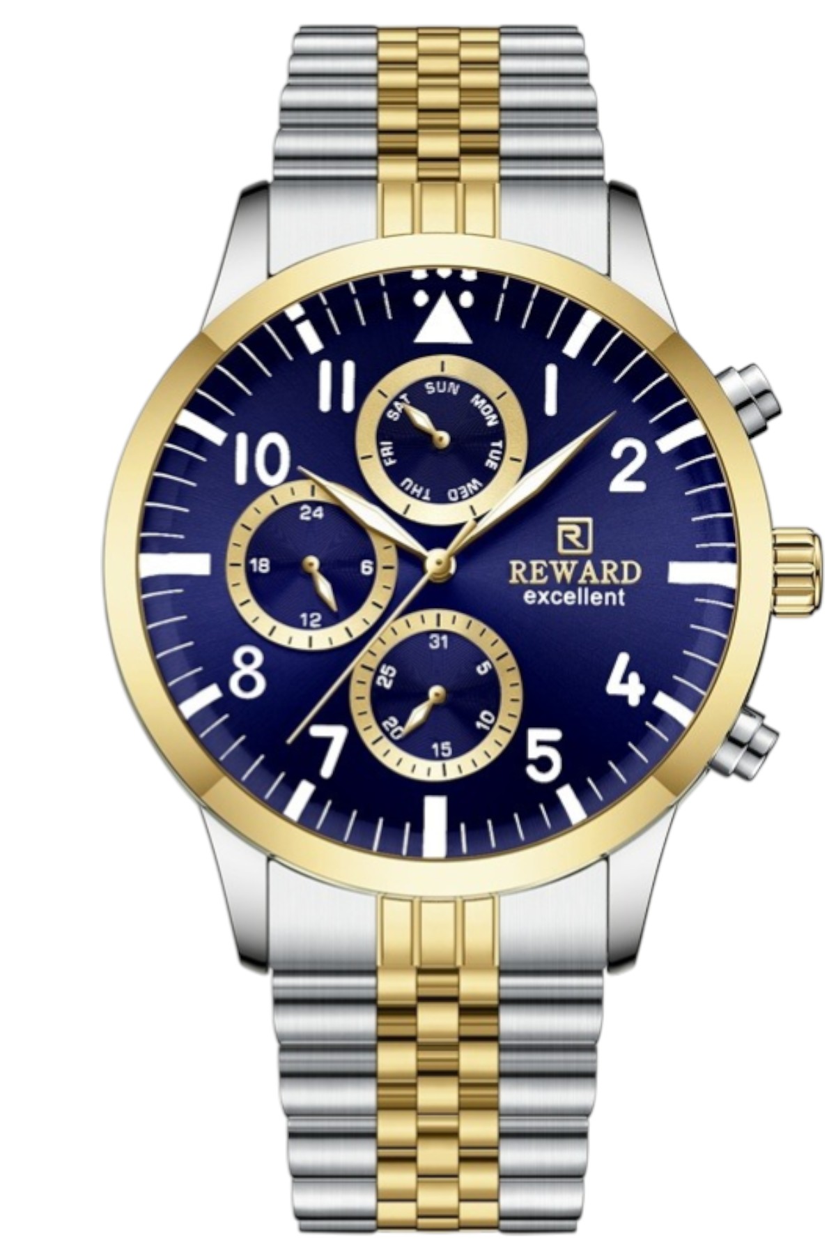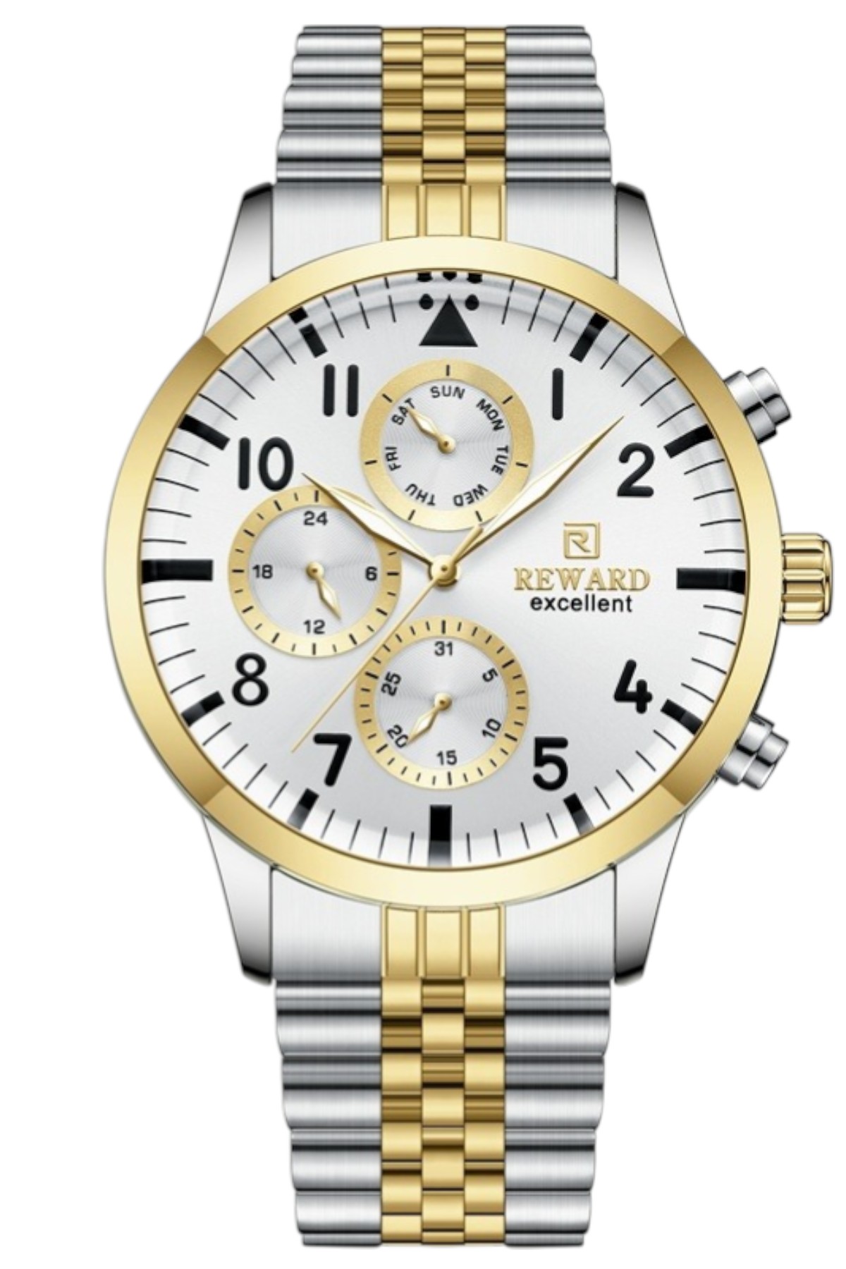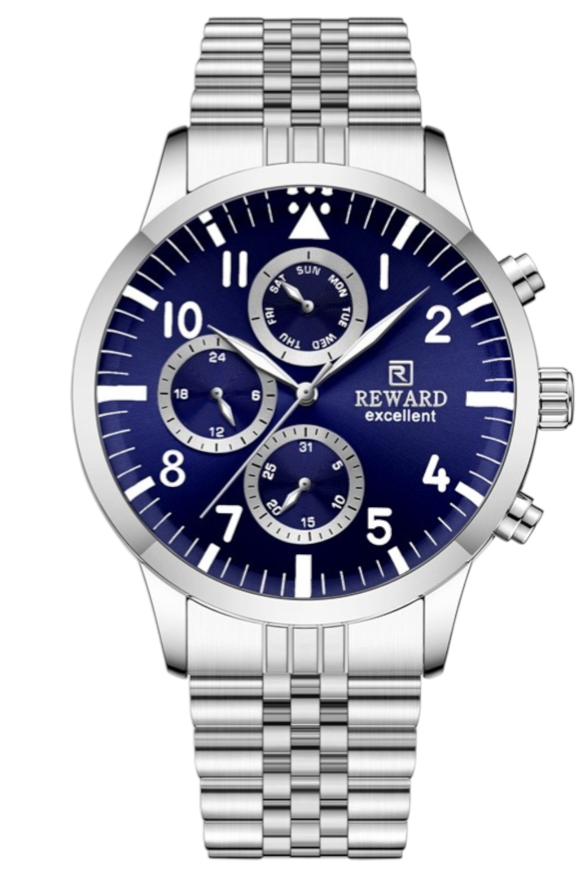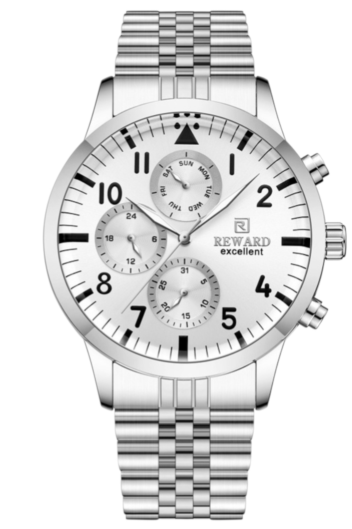 Reward erkek kol saati; günlük kullanımda şıklık ve konforu bir araya getirir.; Ürün Özellikleri: – Mekanizma: Quartz – Kasa Materyali: Çelik (Gümüş) – Kordon Materyali: Çelik (Gümüş) – Kadran Rengi: Siyah – Kasa Çapı: 44 mm – Takvim: Var