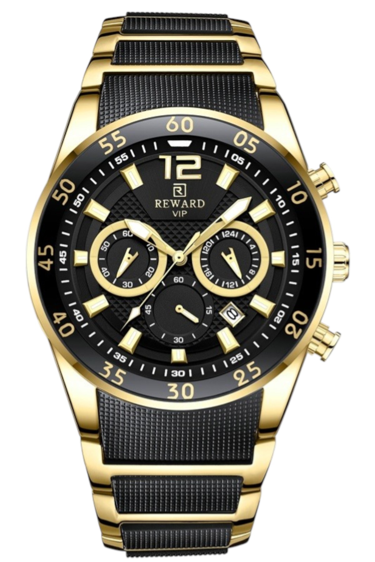Reward erkek kol saati; günlük kullanımda şıklık ve konforu bir araya getirir.; Ürün Özellikleri: – Mekanizma: Quartz – Kasa Materyali: Çelik (Siyah-Altın) – Kordon Materyali: Çelik-Silikon (Siyah-Altın) – Kadran Rengi: Siyah – Kasa Çapı: 45 mm – Takvim: Var