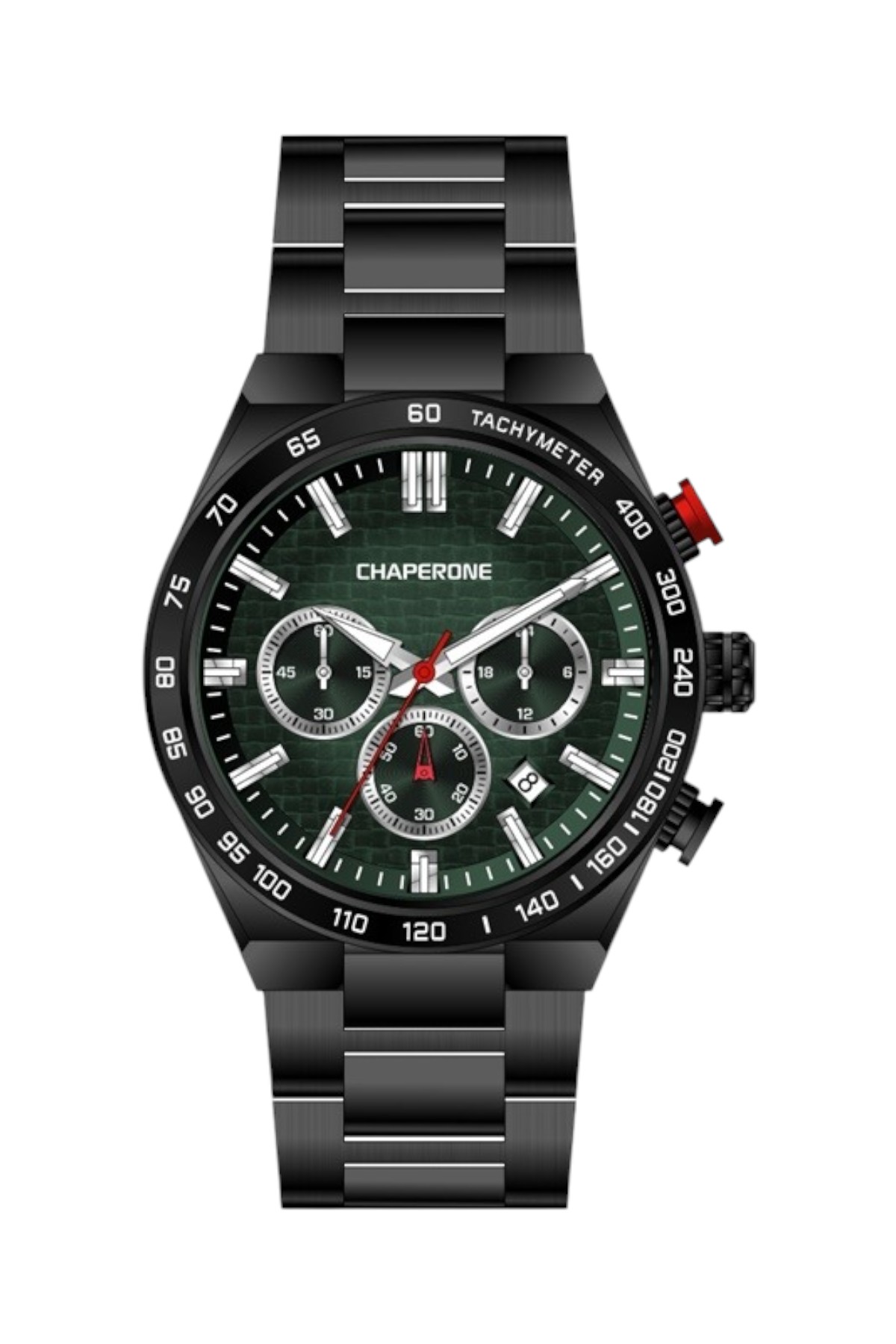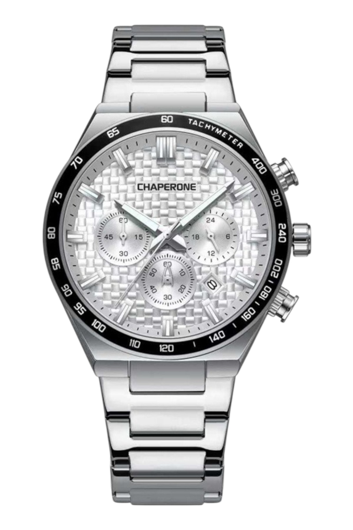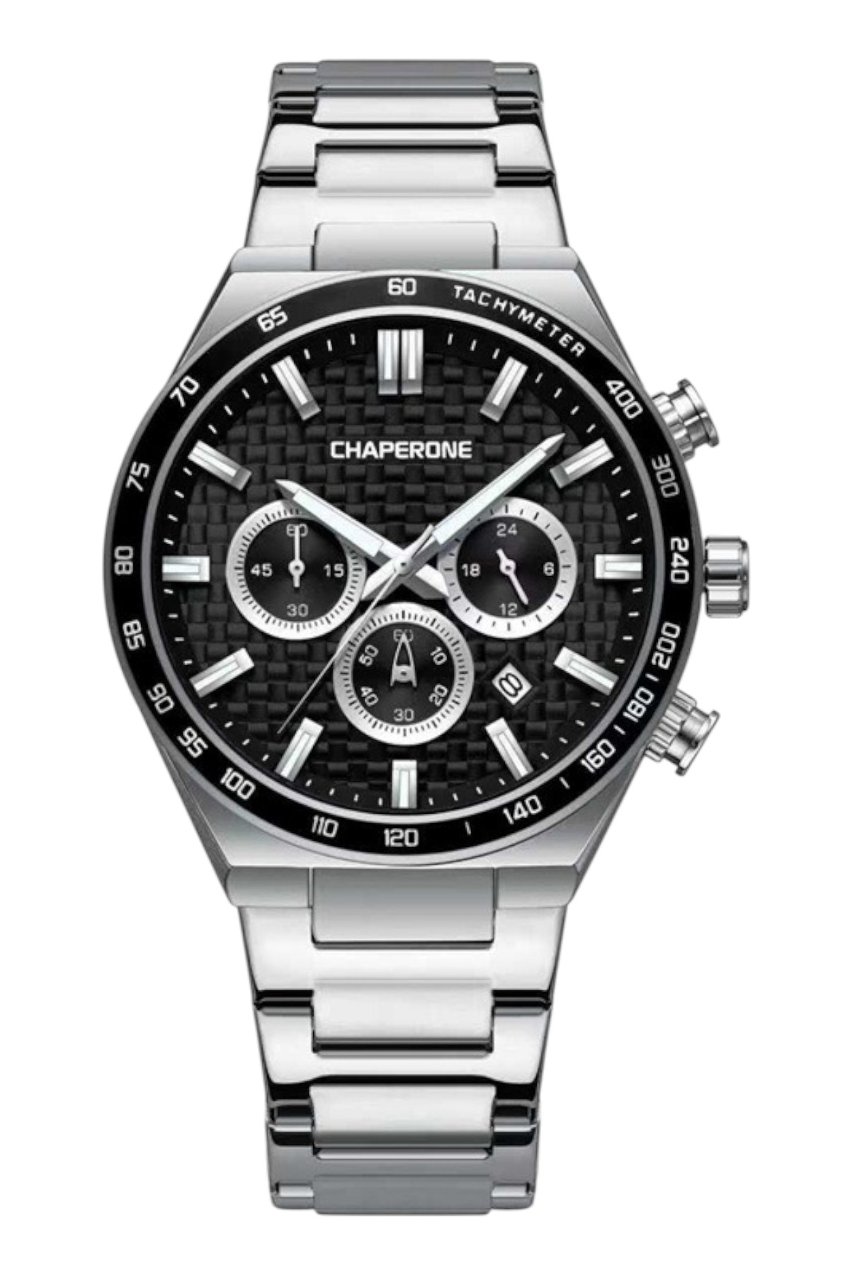Chaperone erkek kol saati; minimal tarz için tasarlanmış, zamansız bir modeldir.; Öne Çıkan Özellikler: – Mekanizma: Quartz – Kasa çapı: 43 mm – Kasa kalınlığı: 12 mm – Kasa materyali: Çelik – Kordon materyali: Çelik – Kadran rengi: Siyah – Kasa rengi: Gümüş – Kordon rengi: Gümüş – Takvim: Var Hediyelik olarak tercih edilebilir.; Ürün Kodu: C000724