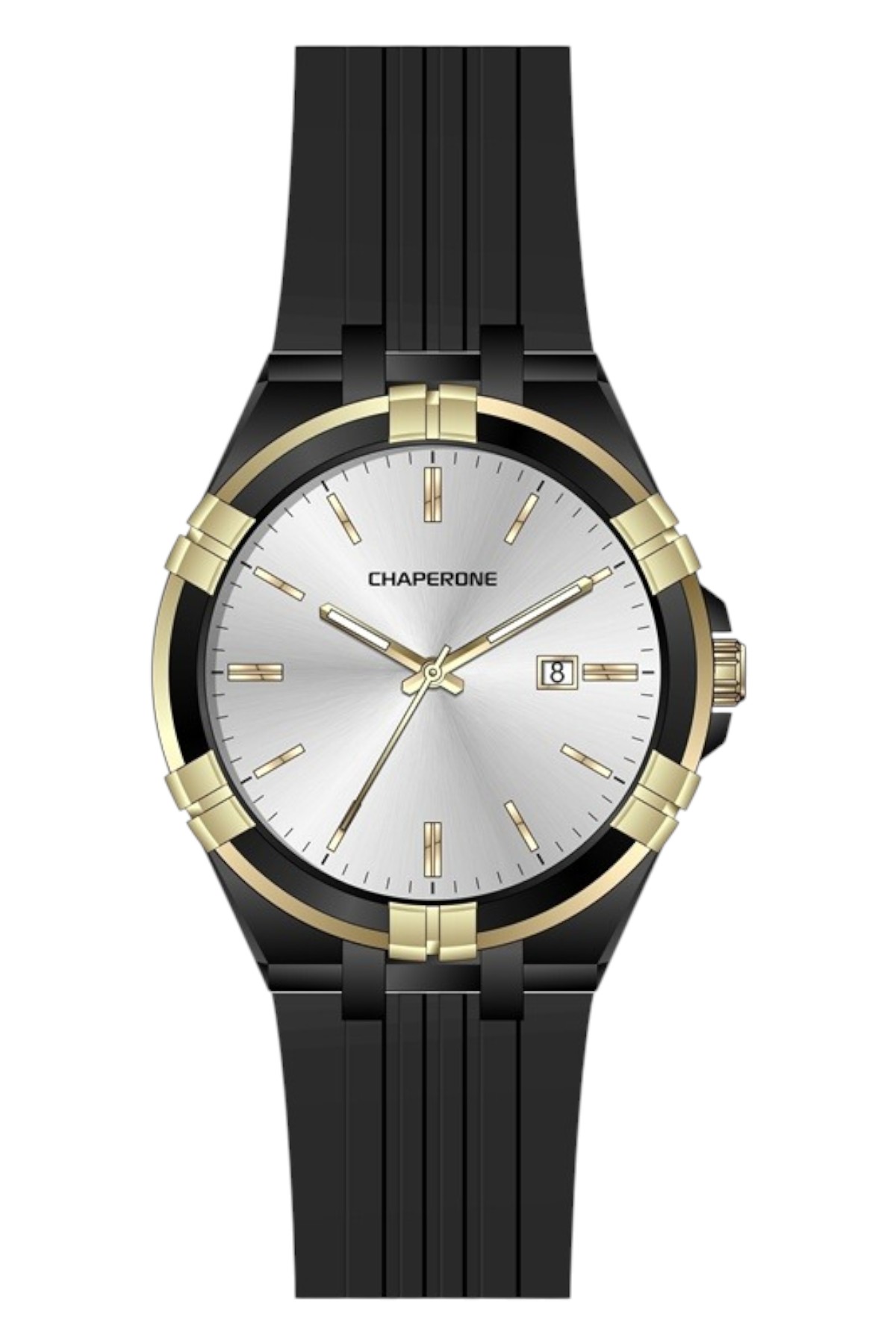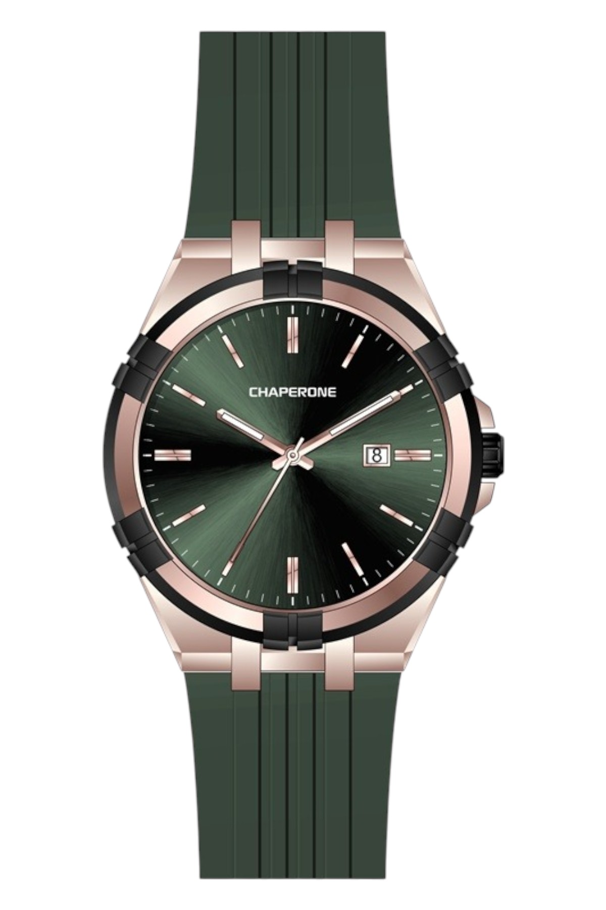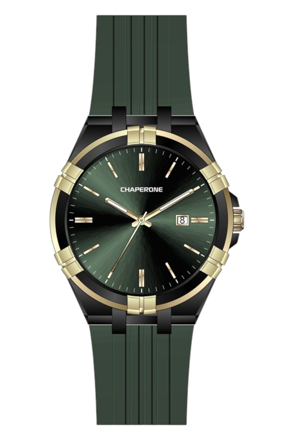 Chaperone erkek kol saati; günlük kullanım için tasarlanmış, zamansız bir modeldir.; Öne Çıkan Özellikler: – Mekanizma: Quartz – Kasa çapı: 43 mm – Kasa kalınlığı: 11 mm – Kasa materyali: Çelik – Kordon materyali: Silikon – Kadran rengi: Yeşil – Kasa rengi: İki Renk – Kordon rengi: Yeşil – Takvim: Var Hediyelik olarak tercih edilebilir.; Ürün Kodu: C001395