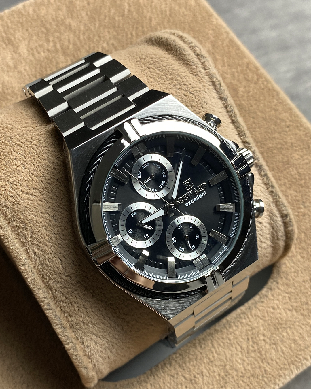 Siyah kadranın güçlü ve net duruşunu, gümüş metal kasa ve gümüş çelik kordon ile tamamlayan bu erkek saat modeli; hem klasik hem de modern kombinlere kolayca uyum sağlar. 45 mm kasa çapı bilekte dikkat çekici bir görünüm sunarken, 13 mm kasa kalınlığı saate sportif bir karakter kazandırır.